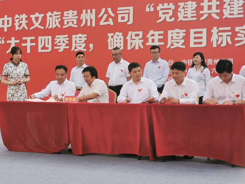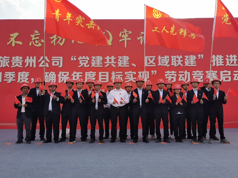 9月27日下午,中铁文旅贵州公司组织中铁二局、四局、五局、八局、九局、建工集团200余人参建职工在中铁国际生态城举行了“党建共建、区域联建”推进会暨“大干四季度,确保年度目标实现”劳动竞赛启动仪式。建筑公司纪委书记张文军出席仪式,并代表公司党委与中铁文旅贵州公司党委签订了“党建共建、区域联建”协议书。在授旗仪式环节,悦龙国际城项目部书记、经理、团支部书记分别上台从授旗领导手中接过了党员先锋队、工人先锋号、青年突击队旗帜。